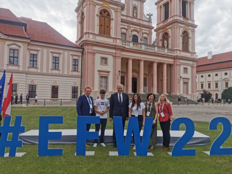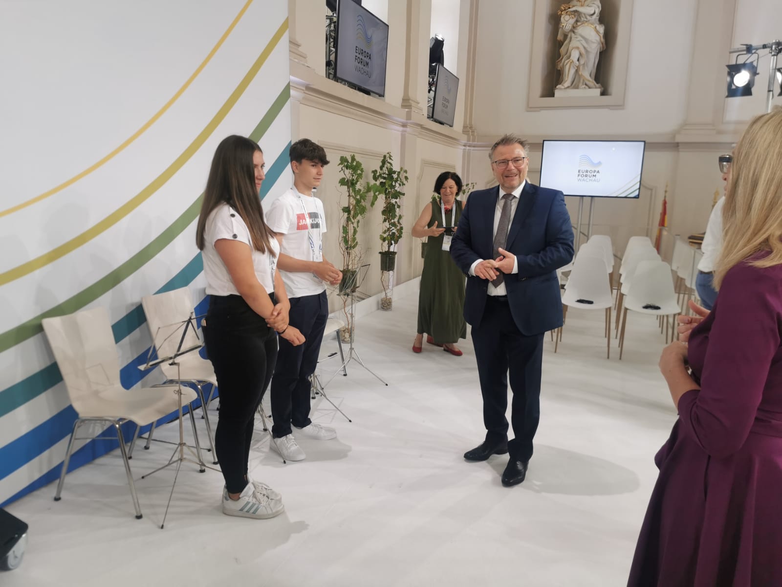 Tina Kogelbauer und Jakob Schrammel aus der vierten Klasse der Mittelschule Scheiblingkirchen wurden von Landesrat Dr. Martin Eichtinger zum Europaforum Wachau im Stift Göttweig eingeladen. Bei einem Interview durften die beiden über ihre Erlebnisse in Brüssel berichten. Direktor Bernhard Brunner sowie die Lehrerinnen Helga Bauer und Madeleine Postl begleiteten Tina und Jakob.